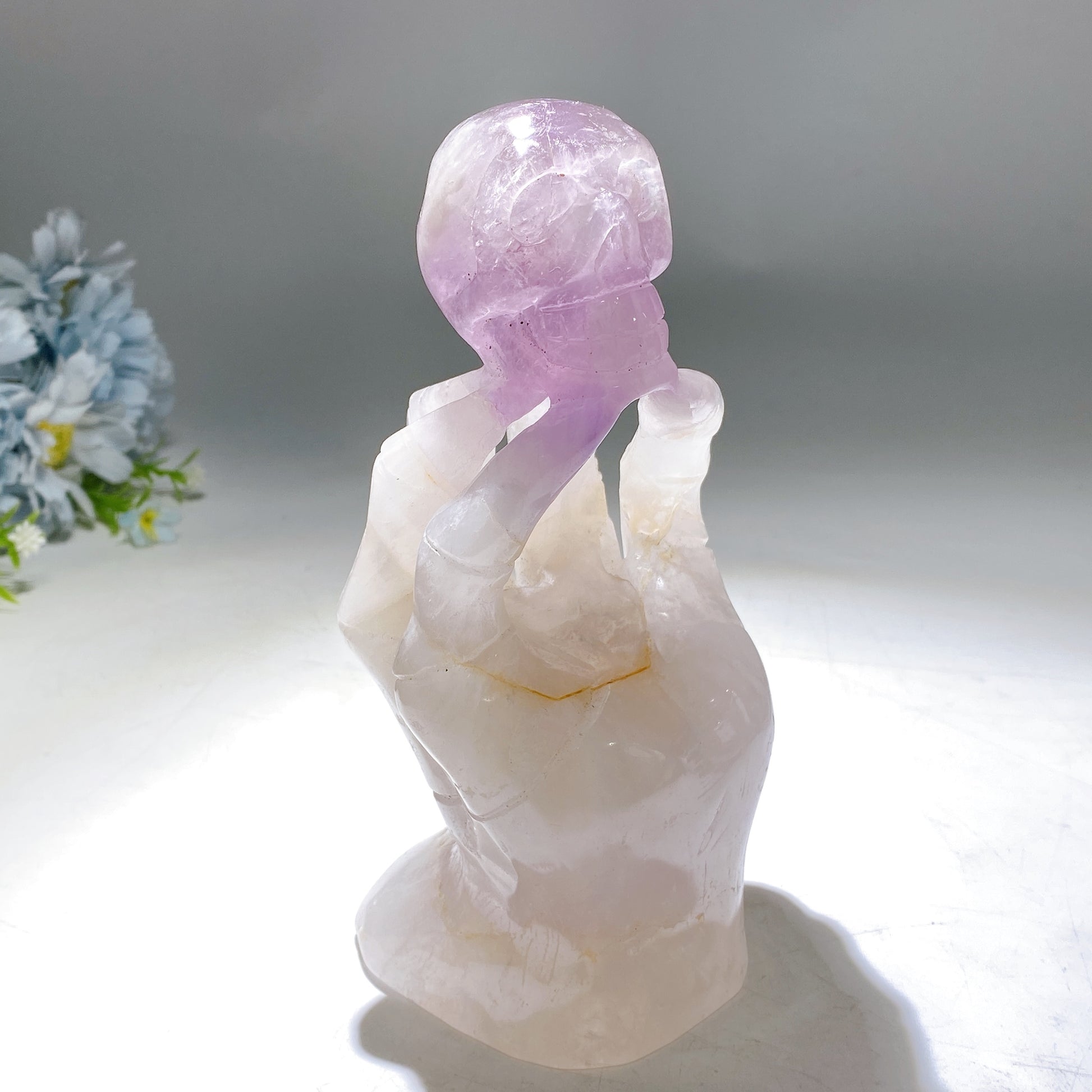 18cm Large Unique Amethyst Grow with Quartz Ghost Hand Holding Skull Carving Crystal Healing Bulk Wholesale