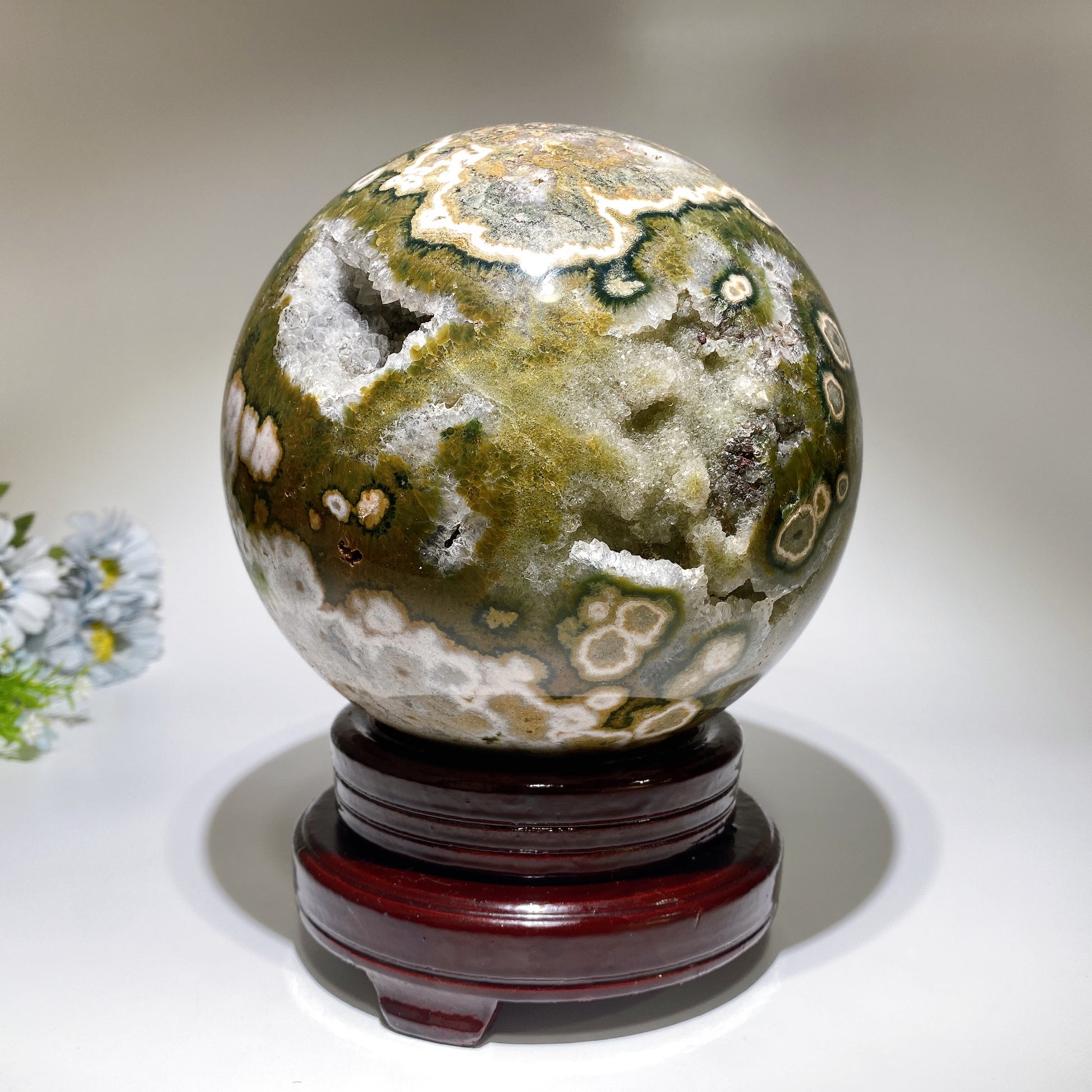 Large Unique Druzy Ocean Jasper Sphere with Wooden Stand Crystal Healing Bulk Wholesale